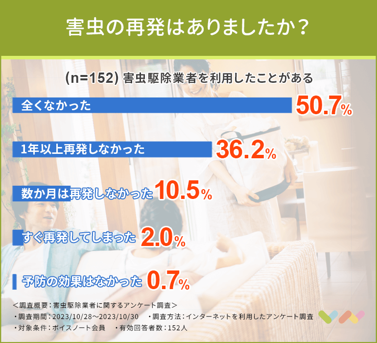 もちろん、害虫は生き物なので絶対に再発はしないとは言い切れませんが、アンケート結果を見る限り効果はしっかり出ていることがわかるでしょう。