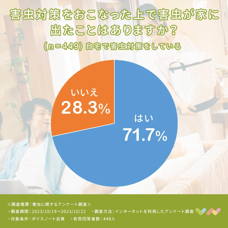 実際に今回アンケートに答えてもらった人に、対策後も害虫は出たかを聞いてみたところ100%害虫がでないことはないようです。