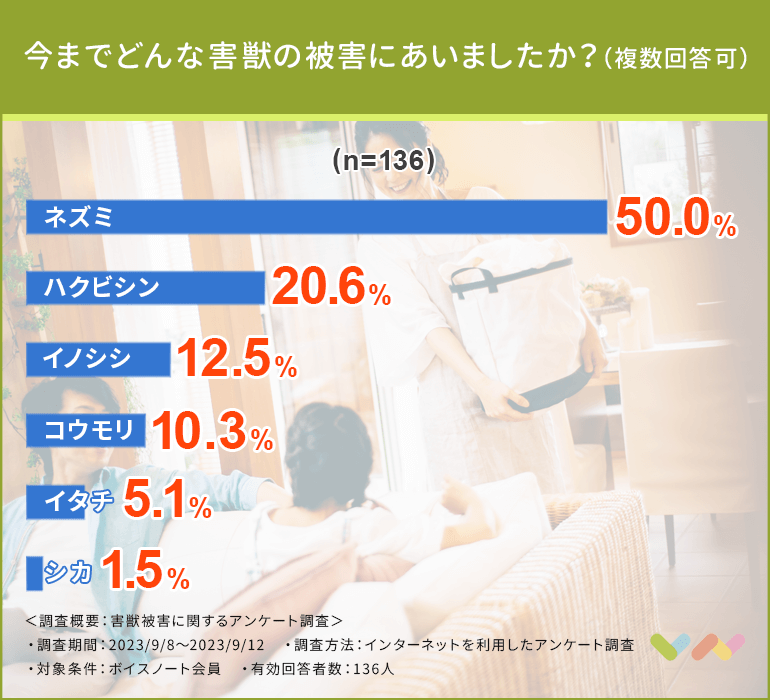 全体の50%の人がネズミの被害に遭っており、次にハクビシン、イノシシと続いています。