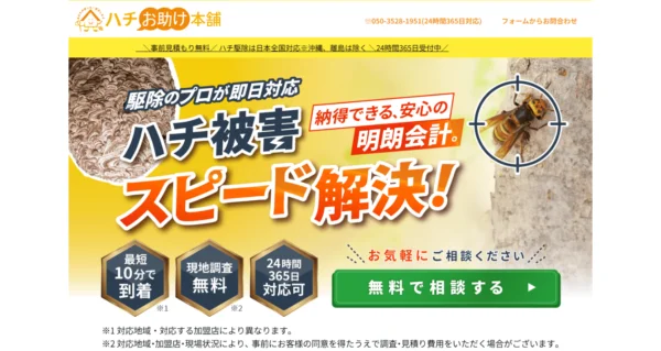 ハチ110番は対応スピードの早さにも定評がある業者です。