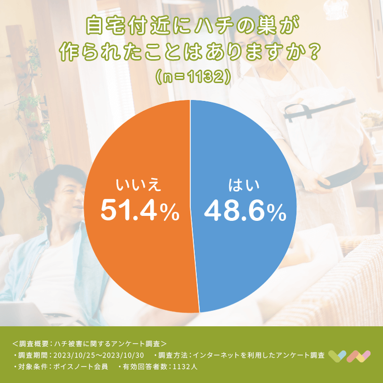 今回、ボイスノート会員1132人にアンケートをとったところ、48.6%の人が自宅付近に巣をつくられたと解答しています。