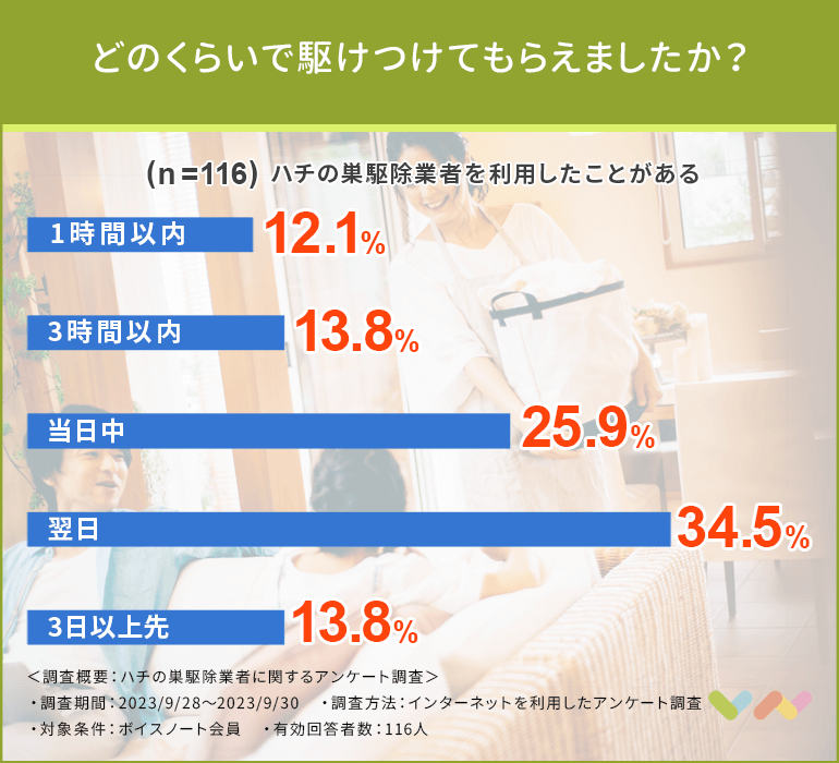 今回は実際にハチの巣駆除業者を利用したことがある人に、どんな状況で依頼したのか、依頼からどのくらいで駆けつけてもらえたのかアンケートをとりました!
