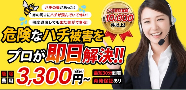 ハチ110番はプロのハチ駆除スタッフが、相談から最短10で駆けつけるスピード対応が強みです。