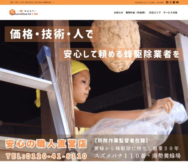 スズメバチ110番・南勢養蜂場は、とても経験が豊富で信頼のできる蜂の巣駆除業者です。