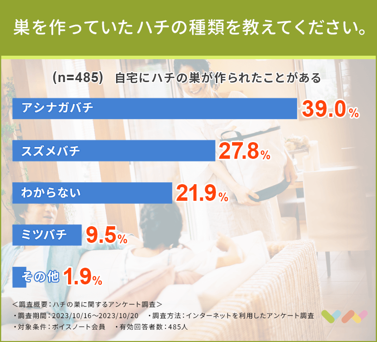 次に、巣が作られたハチの種類はアシナガバチ(39.0%)が一番多かったです。