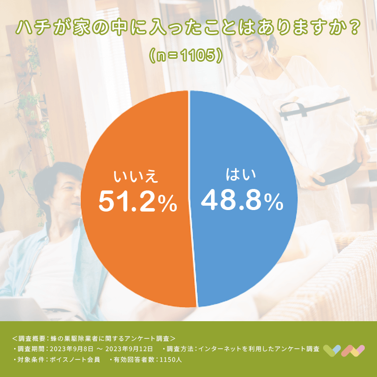 アンケートによると、48.8%の人が家の中にハチが入ったことがあると答えています。