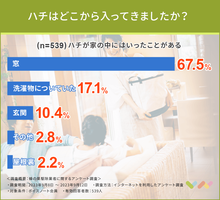 次に、家の中にハチが入ったことがあると回答した人にハチがどこから入ってきたのか聞いてみました。