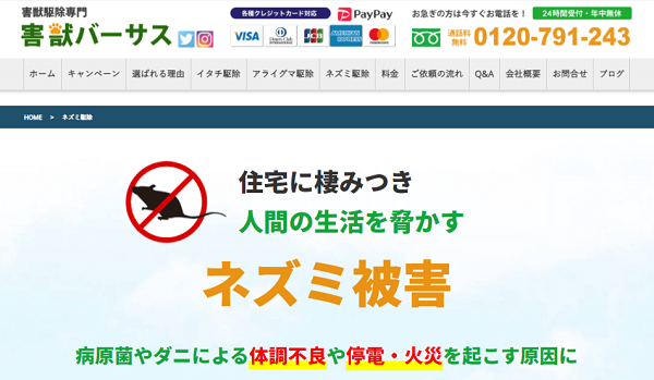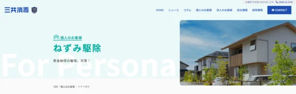 名称 | ねずみ110番 | 害獣駆除対策センター | くじょじまん | 三共消毒 | ダスキン | 害獣プロテクト | 大洋防疫研究所 | 害虫害獣おたすけ本舗 | 害獣バーサス |
