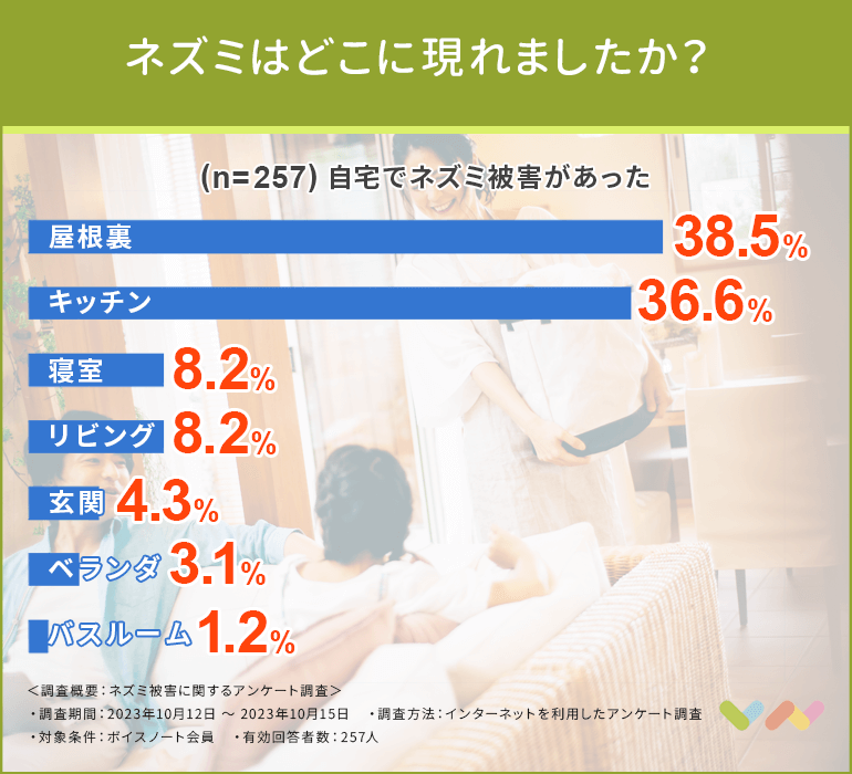 結果を見ると屋根裏(38.5%)とキッチン(36.6%)が多いことがわかりました。
